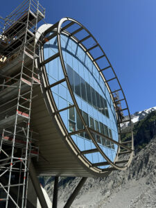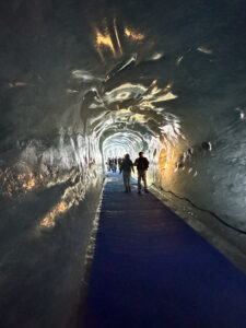 Once inside the glacier, visitors are treated to an icy tunnel whose walls are embedded with messages about glaciers, displays of information and rooms set up for photo opportunities with a sculpted hearth and a bar displaying the Olympic rings.