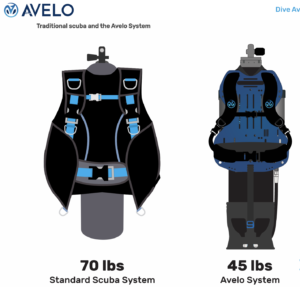 Here are a few of the differences from standard scuba gear that justify the term “revolutionary”. Unlike standard scuba which requires the diver wear a vest with an internal air bladder, the Avelo system has no vest. In fact, it also does not require the weights that most regular divers carry in order to submerge, meaning the overall kit is approximately 35 pounds lighter, depending on the weight a diver would usually carry. Similar to a submarine, you simply add some water to the air tank (ballast) when you want to descend.